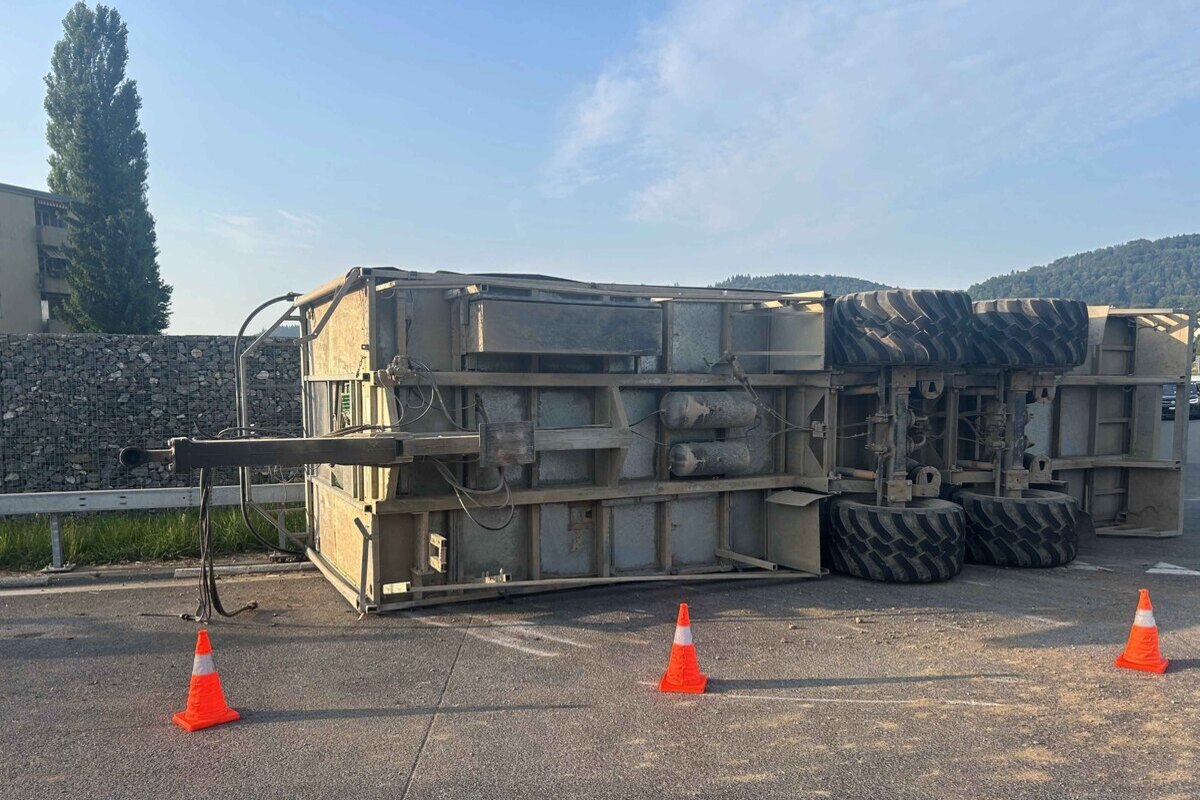 Kurz vor der Ausfahrt in Richtung Mellingen Zentrum kippte der Anhänger um und fiel seitlich zu Boden. Der Traktor blieb stehen.